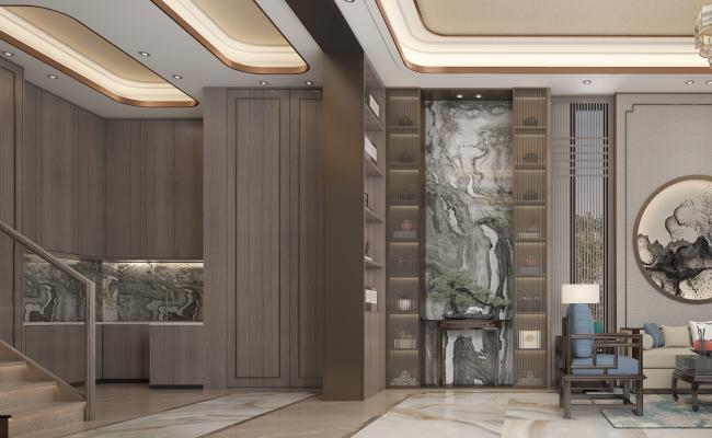 空間以可可蛋奶色系與淺灰為基底,雕花穹頂垂落水晶光瀑。復(fù)式層階以弧形曲線延展,鎏金勾邊如凝固的旋律。巖板樓梯與琺瑯玻璃裝飾對話歲月,古董鏡廊折射流動(dòng)光影。摒棄浮華堆砌,于凡爾賽式骨架中留呼吸之白,終將古典魂靈凝練為當(dāng)代謐境,成就一處可棲心的精神殿宇。
