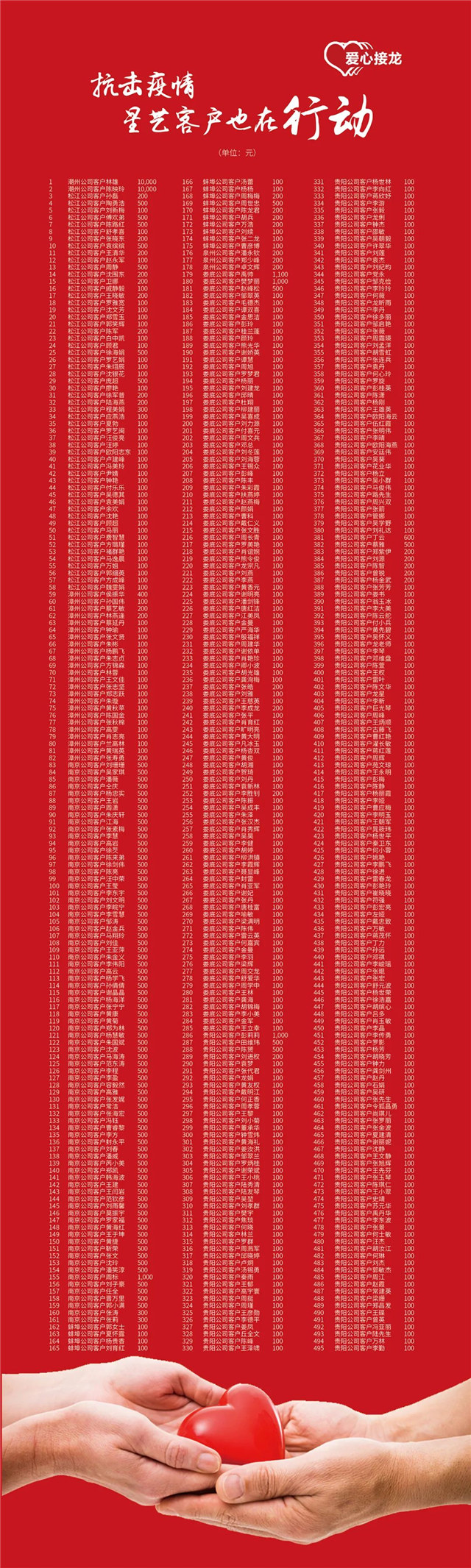 您的當(dāng)前位置:首頁關(guān)于我們>公司新聞>抗擊疫情,2020星藝客戶為愛“接龍”