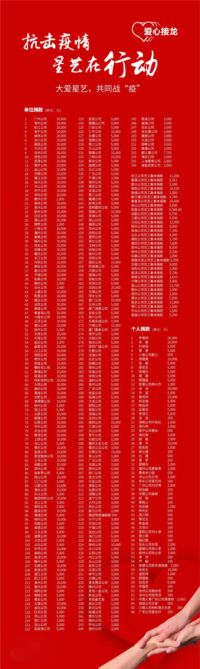 從星藝裝飾“愛心接龍”開啟以來,星藝全國眾多單位積極捐款,星藝員工自愿捐款,甚至星藝客戶也通過“愛心接龍”捐款……同心抗疫,星藝在行動,凝聚起抗擊疫情的強大力量!